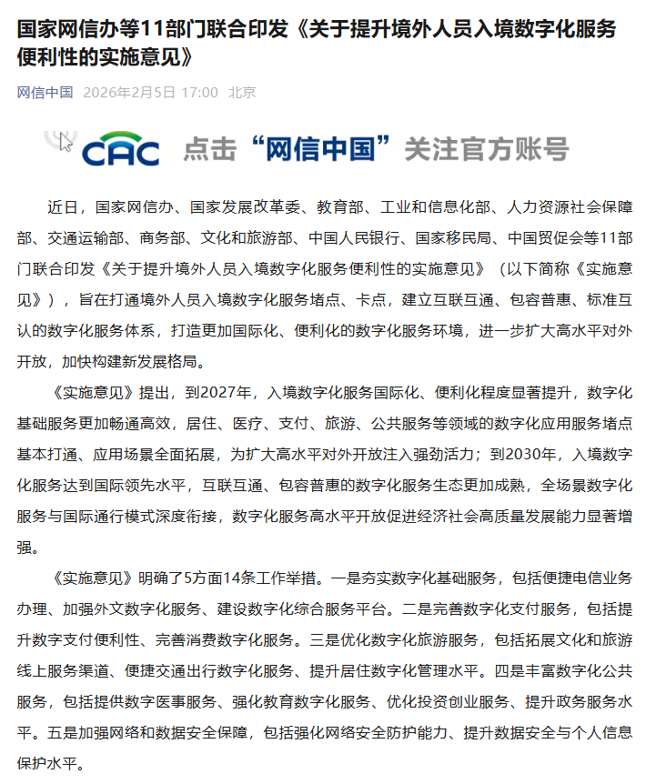 國家網(wǎng)信辦等 11 部門:到 2030 年,入境數(shù)字化服務(wù)達(dá)到國際領(lǐng)先水平