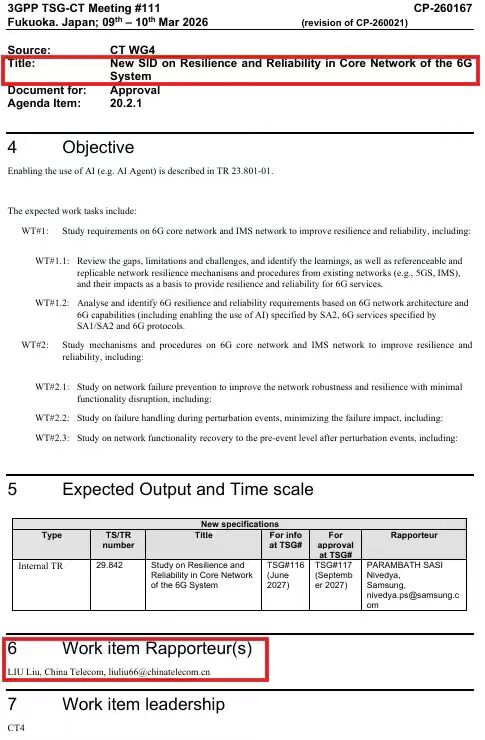 近日,3GPP核心網(wǎng)與終端技術(shù)規(guī)范組(TSG CT)第111次全會(huì)在日本福岡舉行。會(huì)上,由中國(guó)電信牽頭的“6G系統(tǒng)彈性和可靠性研究”項(xiàng)目成功獲批立項(xiàng)。該項(xiàng)目由中國(guó)電信研究院核心網(wǎng)技術(shù)研究所90后青年骨干劉柳擔(dān)任報(bào)告人,是中國(guó)電信在3GPP CT領(lǐng)域牽頭的首個(gè)6G網(wǎng)絡(luò)標(biāo)準(zhǔn)項(xiàng)目,也是本次會(huì)議首批通過(guò)的四個(gè)6G項(xiàng)目之一。