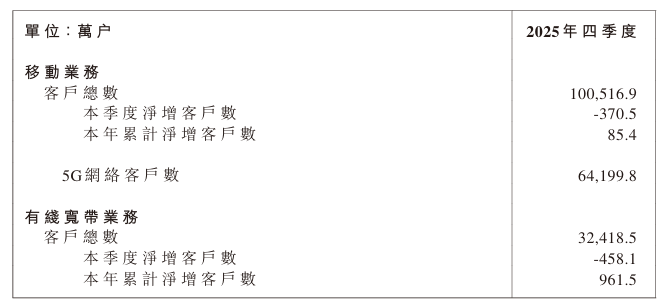 數(shù)據(jù)顯示,2025年第四季度,中國(guó)移動(dòng)用戶總數(shù)達(dá)到10.05169億戶,第四季度用戶數(shù)較少370.5萬(wàn)戶;5G網(wǎng)絡(luò)用戶數(shù)達(dá)6.41998億戶,本季度凈增1964.5萬(wàn)戶。有線寬帶方面,中國(guó)移動(dòng)有線寬帶用戶總數(shù)達(dá)到 3.24185億戶,本季度減少458.1萬(wàn)戶。