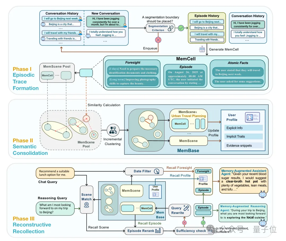 具體來講,EverMemOS通過模擬人類記憶的形成并轉(zhuǎn)化為計(jì)算框架,利用三階段層層遞進(jìn)以實(shí)現(xiàn)大模型長期記憶的存儲(chǔ)和提。