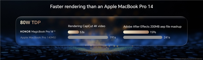 榮耀MagicBook Pro 14 2026搭載全新一代HONOR Turbo X技術(shù),可智能識(shí)別辦公、游戲、視頻等日常使用場(chǎng)景,優(yōu)化能效調(diào)度策略、動(dòng)態(tài)分配系統(tǒng)資源、調(diào)節(jié)設(shè)備功耗,帶來(lái)最高80W性能釋放。實(shí)測(cè)數(shù)據(jù)顯示,榮耀MagicBook Pro 14 2026的4K視頻渲染導(dǎo)出速度優(yōu)于蘋果MacBook Pro 14,還可流暢運(yùn)行《賽博朋克2077》《黑神話:悟空》《極限競(jìng)速:地平線5》等主流3A游戲大作,帶來(lái)3A游戲絕佳體驗(yàn)。