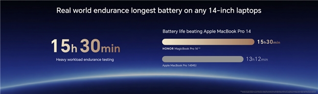 作為14英寸輕薄本續(xù)航標(biāo)桿,榮耀MagicBook Pro 14 2026配備92Wh大容量電池,結(jié)合新一代自研HONOR Turbo X技術(shù),帶來(lái)15.5小時(shí)的超長(zhǎng)續(xù)航表現(xiàn),全面超越蘋果MacBook Pro 14,再次刷新14英寸輕薄本行業(yè)的超長(zhǎng)續(xù)航紀(jì)錄。