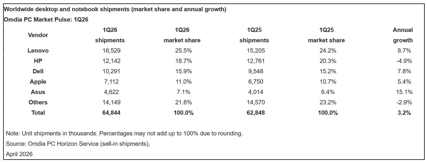 4 月 9 日消息,根據(jù) Omdia 最新數(shù)據(jù),2026 年第一季度全球臺式機(jī)、筆記本和工作站總出貨量同比增長 3.2%,達(dá)到 6480 萬臺。