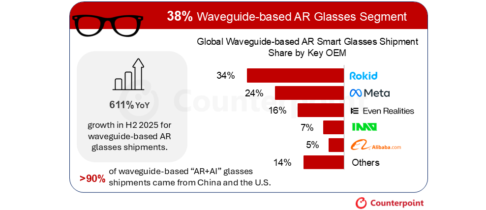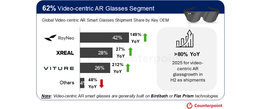 CounterPoint 報告 2025 下半年全球 AR 眼鏡出貨量增 148%:視頻型雷鳥占 42%、波導型樂奇 34% 領跑
