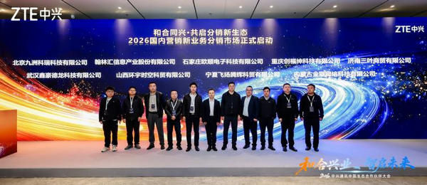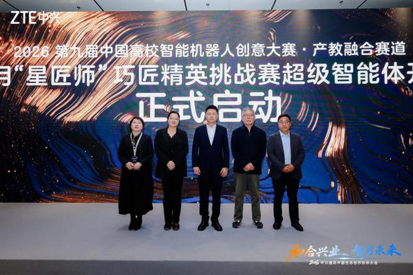 同時(shí),兩大重磅啟動(dòng)儀式相繼舉行:一是聚焦AI與智能機(jī)器人創(chuàng)新的2026中興捧月“星匠師”巧匠精英挑戰(zhàn)賽正式啟動(dòng),由中興通訊副總裁張亮、中國(guó)通信工業(yè)協(xié)會(huì)會(huì)長(zhǎng)王秉科、大學(xué)生賽事工作組成員趙春魚(yú)、武漢豐邁信息技術(shù)有限公司總經(jīng)理胡波、遼寧向日葵數(shù)字技術(shù)股份有限公司總經(jīng)理李艷飛共同啟動(dòng);二是“2026國(guó)內(nèi)營(yíng)銷(xiāo)新業(yè)務(wù)分銷(xiāo)市場(chǎng)”正式啟動(dòng),攜手生態(tài)伙伴共建分銷(xiāo)新生態(tài),共推教育、醫(yī)療、商業(yè)數(shù)字化轉(zhuǎn)型落地,由中興通訊新業(yè)務(wù)總監(jiān)辦副總經(jīng)理蘆曉飛、中興通訊智慧家庭項(xiàng)目部產(chǎn)品總監(jiān)王巍及9家分銷(xiāo)商代表共同啟動(dòng)。