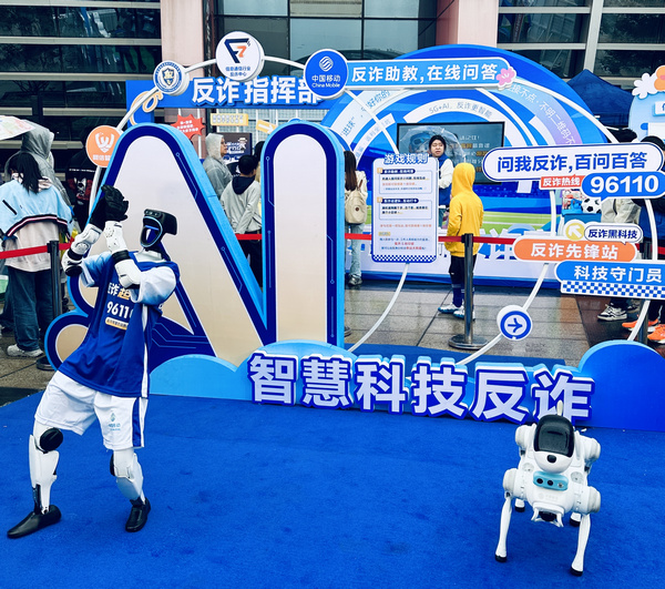 反詐宣傳活動(dòng)現(xiàn)場(chǎng),靈動(dòng)的機(jī)器狗在人群中穿梭,時(shí)而翻滾、時(shí)而作揖,引得孩子們爭(zhēng)相模仿,家長(zhǎng)們紛紛舉起手機(jī)拍照。一旁的反詐智能機(jī)器人則成了“主考官”,隨機(jī)從海量反詐題庫中抽題“拷問”觀眾,還能實(shí)時(shí)識(shí)別語音答案、判斷對(duì)錯(cuò)。“所有打著‘刷單返利’旗號(hào)的兼職,全都是詐騙,對(duì)還是錯(cuò)?”機(jī)器人問道!皩(duì)!”一位年輕球迷脫口而出!肮材,答對(duì)了!”工作人員隨即將這位幸運(yùn)球迷引導(dǎo)至抽獎(jiǎng)區(qū)試試手氣,引來一片歡呼。