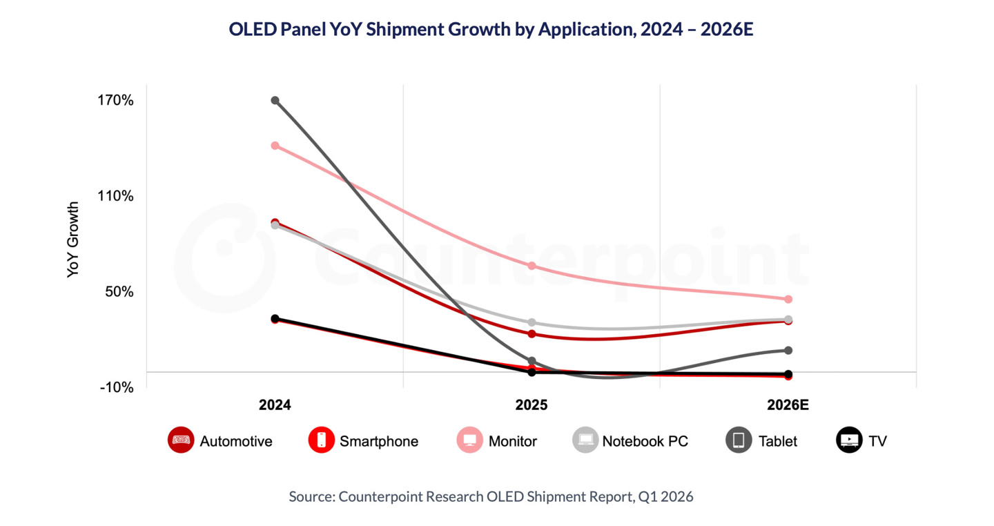 從整體 OLED 市場來看,2026 年出貨量預(yù)計(jì)將保持平穩(wěn)。顯示器市場預(yù)計(jì)增長 45%,平板市場增長 13%,汽車顯示領(lǐng)域也有所貢獻(xiàn)。