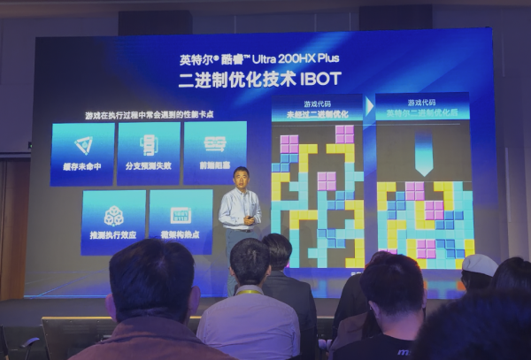 現(xiàn)場伴手禮口袋中多面色彩的魔方則似乎預示AI高靜游戲本Plus背后的芯片升級。英特爾在發(fā)布會現(xiàn)場用俄羅斯方塊來形象比喻新一代英特爾酷睿Ultra 200HX Plus處理器中二進制優(yōu)化技術(IBOT),高宇將在沒有優(yōu)化的處理器運行情況下,如同胡亂堆砌的不規(guī)則方塊,稱之為“CPU運行氣泡”,而空轉的CPU并不能產生實際運行效果。通過IBOT方式優(yōu)化后,可擠出大量氣泡,提升CPU執(zhí)行效率。