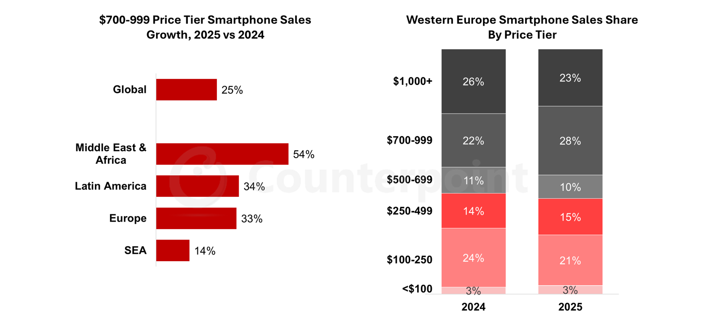 “平價(jià)旗艦”在 2025 年已是全球智能手機(jī)增長(zhǎng)最快的細(xì)分市場(chǎng),銷量較 2024 年提升了 25%,在西歐成為了當(dāng)?shù)刈钍軞g迎的品類。高端功能與相對(duì)較低的購(gòu)入成本使此類產(chǎn)品成為當(dāng)下的均衡之選。