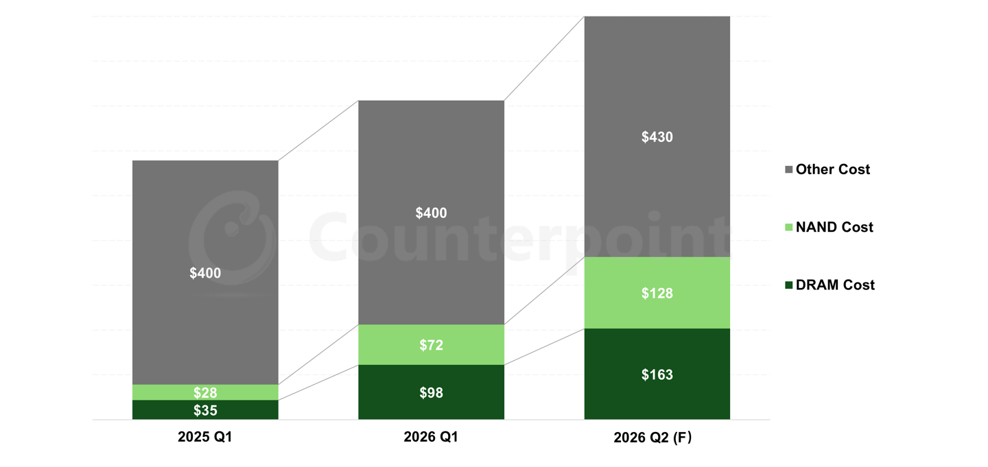 最終,高端智能手機(jī)在 2026Q2 末的物料成本將較 2025Q1 增加超過(guò) 150 美元,這可能導(dǎo)致最終零售價(jià)上漲超過(guò) 200 美元(現(xiàn)匯率約合 1377 元人民幣)。