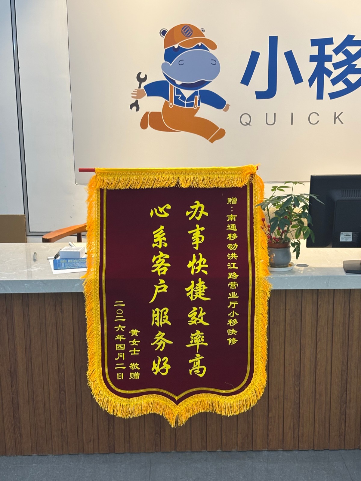 為表感謝,黃女士特意定制錦旗送至服務(wù)廳,高度贊揚南通移動小移快修高效貼心、有溫度有擔(dān)當(dāng)?shù)姆⻊?wù),稱贊南通移動工作人員真正做到急用戶之所急、解用戶之所難,以專業(yè)能力與暖心服務(wù)守護了群眾的切身利益!