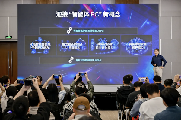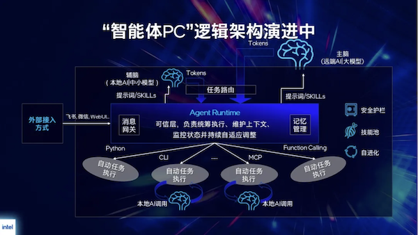 智能體PC是為高效運行智能體而打造的AI PC。它以強大的本地智能體為核心,不僅能自主完成復(fù)雜任務(wù)的閉環(huán)處理,更具備記憶、自主學(xué)習(xí)及迭代進化的能力。它采用的“本地輔腦+云端主腦”混合架構(gòu),能夠高效分配任務(wù),從而實現(xiàn)了性能、隱私保護、成本與響應(yīng)速度的絕佳平衡。其中,“輔腦”能力由PC端的本地AI和中小模型構(gòu)成,“主腦”則協(xié)作遠端AI和大模型。