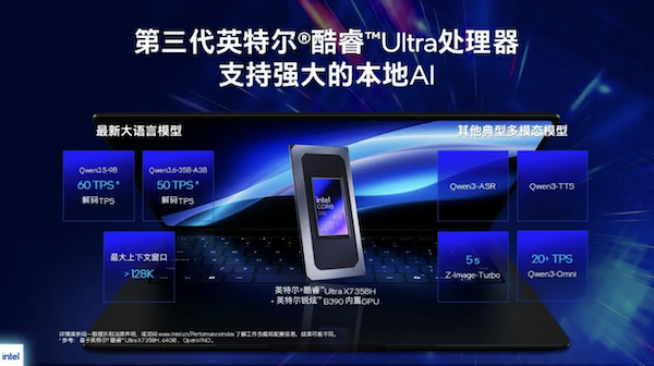 ●旗艦配置:搭載第三代酷睿Ultra X系列處理器并配備32GB以上內(nèi)存,能夠流暢運行Qwen3.5/3.6(35B)、Gemma4(26B)等大型語言模型及Qwen3-VL、MiniCPM-O-4.5等復(fù)雜多模態(tài)模型,并同時支持主流與入門級模型和應(yīng)用。
