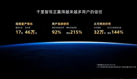 目前千里科技已完成智能駕駛、智能座艙、Robotaxi全產(chǎn)業(yè)鏈布局。趙明介紹,截至2026年3月31日,千里智駕技術(shù)已搭載17款車(chē)型、合計(jì)46萬(wàn)輛汽車(chē),輔助駕駛激活率高達(dá)92%。值得關(guān)注的是,千里智駕從ASD3.0迭代至4.0僅用時(shí)3個(gè)月,ASD3.0首發(fā)即實(shí)現(xiàn)30萬(wàn)輛車(chē)的快速適配。