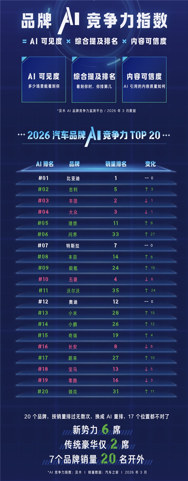 本次報(bào)告覆蓋 Kimi、元寶、文心一言、DeepSeek 四大 AI 平臺(tái),以“AI可見度 × 綜合提及排名 × 內(nèi)容可信度”為核心評(píng)估模型,精準(zhǔn)量化品牌在AI場景中的傳播力與信任度。報(bào)告顯示,不同于傳統(tǒng)銷量排名,AI的推薦邏輯與市場銷量出現(xiàn)明顯分化,TOP20品牌中17個(gè)品牌位次發(fā)生變動(dòng):比亞迪在銷量與AI競爭力雙榜均居榜首;問界、沃爾沃等品牌的AI排名較銷量排名大幅躍升,而奔馳、日產(chǎn)等傳統(tǒng)品牌則出現(xiàn)AI競爭力明顯下滑。