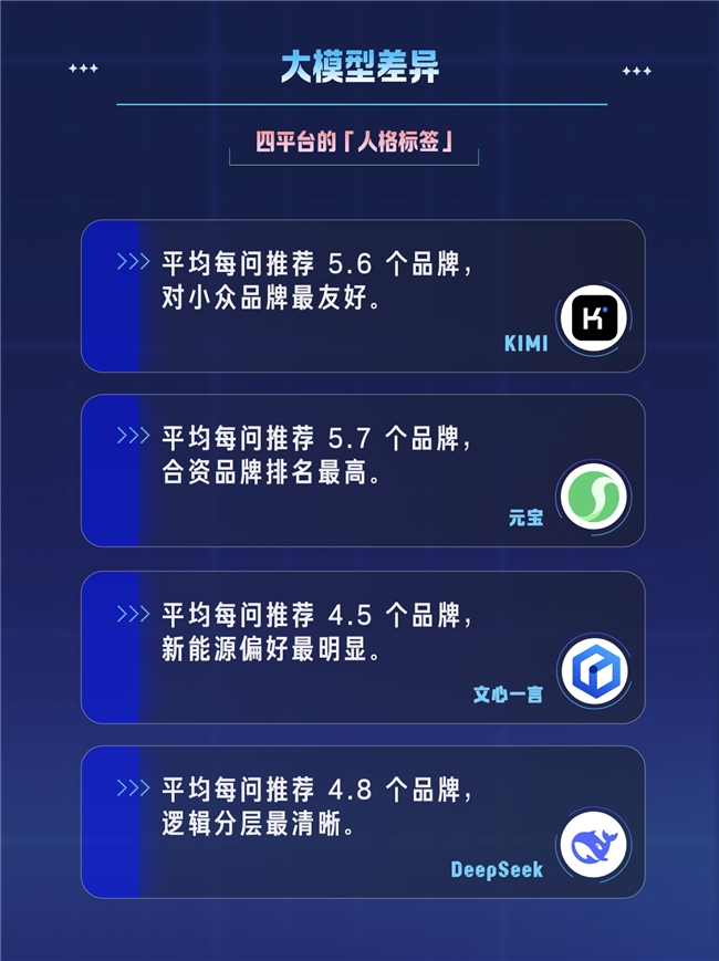 報(bào)告同時(shí)揭示了不同AI平臺(tái)的品牌偏好差異:Kimi平均每問推薦5.6個(gè)品牌,偏好小眾品牌;文心一言更傾向推薦新能源品牌;DeepSeek邏輯分層清晰,元寶生成結(jié)果中合資品牌排名更高。這種平臺(tái)差異,也為品牌精準(zhǔn)布局AI傳播提供了參考依據(jù)。